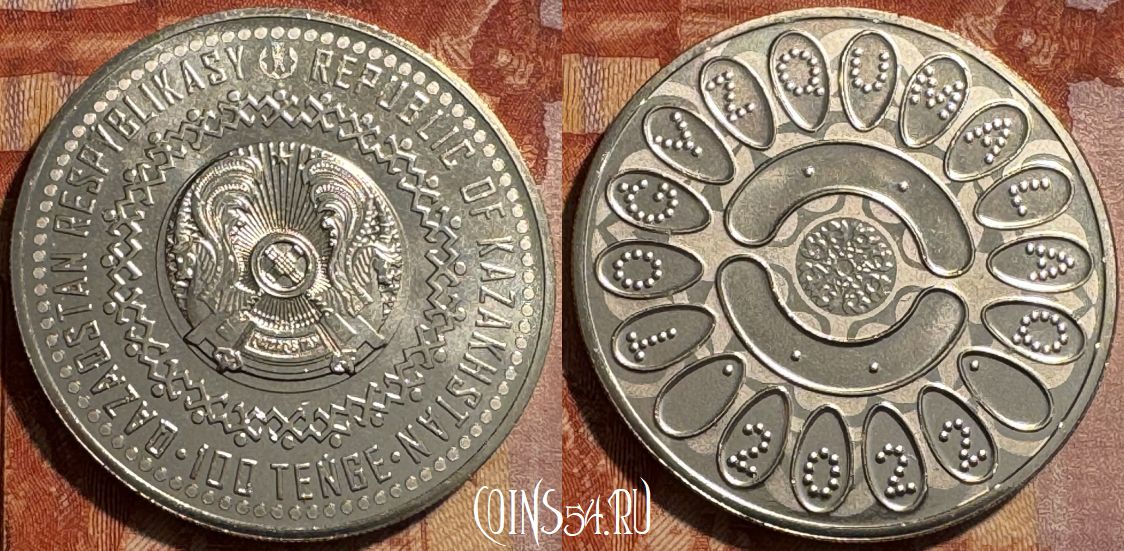 Аверс: 100 TEŃGE QAZAQSTAN RESPYBLIKASY REPUBLIC OF KAZAKHSTAN