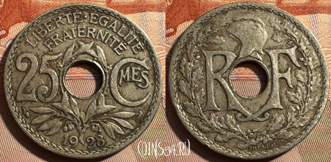 Франция 25 сантимов 1928 года, KM# 867a, 398s-016