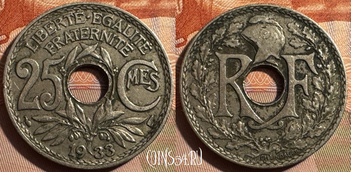 Франция 25 сантимов 1933 года, KM# 867a, 398s-097