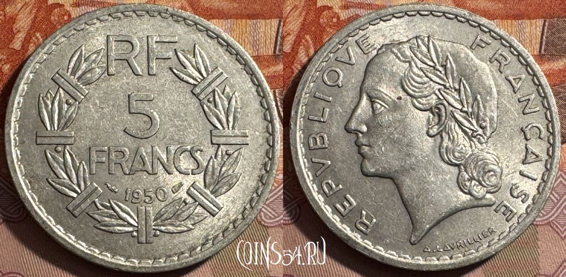 Франция 5 франков 1950 года, KM# 888b, 406s-036