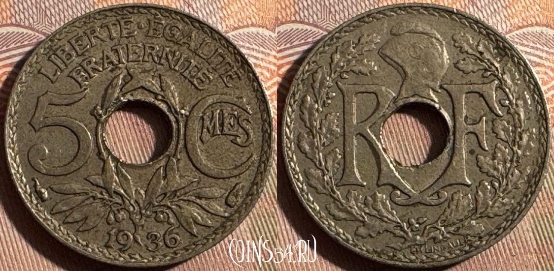 Франция 5 сантимов 1936 года, KM# 875, 353s-048