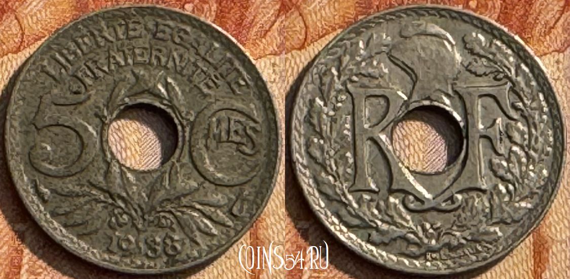 Франция 5 сантимов 1938 года, KM# 875, 279s-100