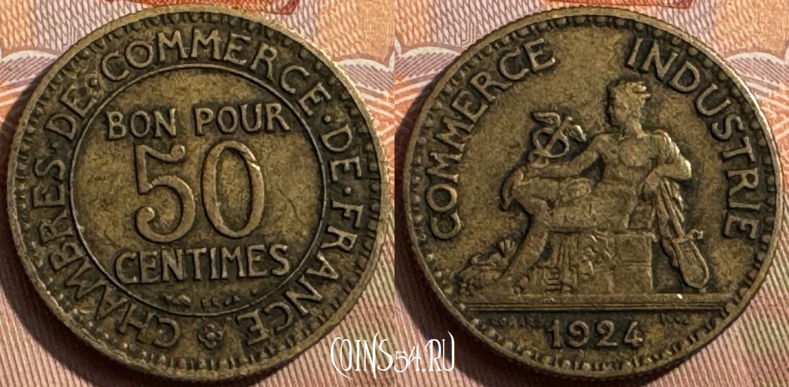 Франция 50 сантимов 1924 года, KM# 884, 383s-096