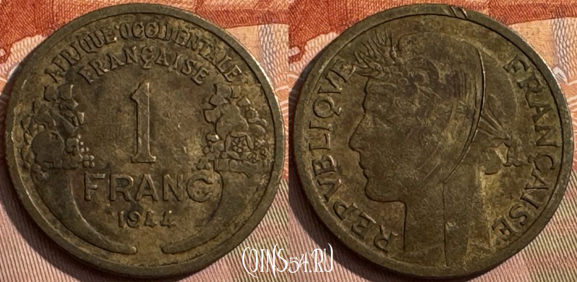 Французская Западная Африка 1 франк 1944 года, KM# 2, 391s-099