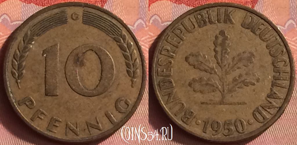 Германия 10 пфеннигов 1950 года G, KM# 108, 427o-026