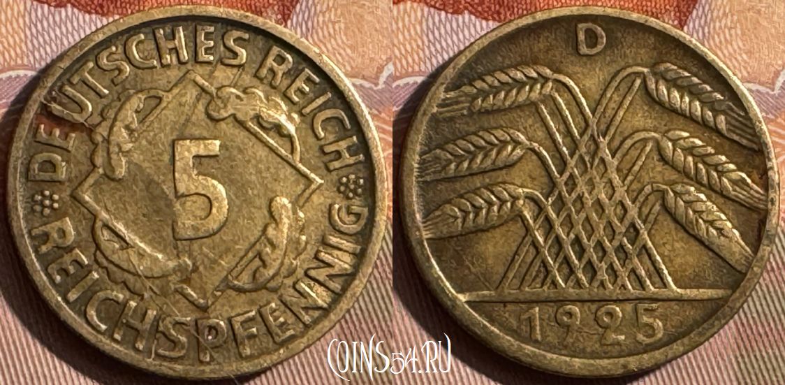 Германия 5 рейхспфеннигов 1925 года D, KM# 39, 373s-108