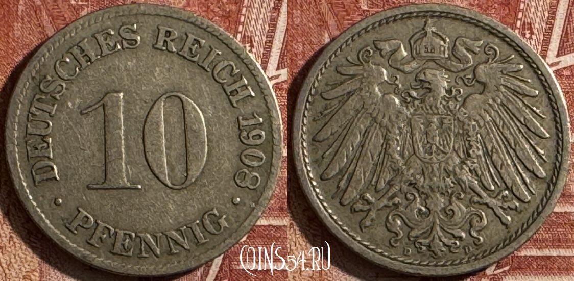 Германия (Империя) 10 пфеннигов 1908 года D, KM# 12, 505s-034