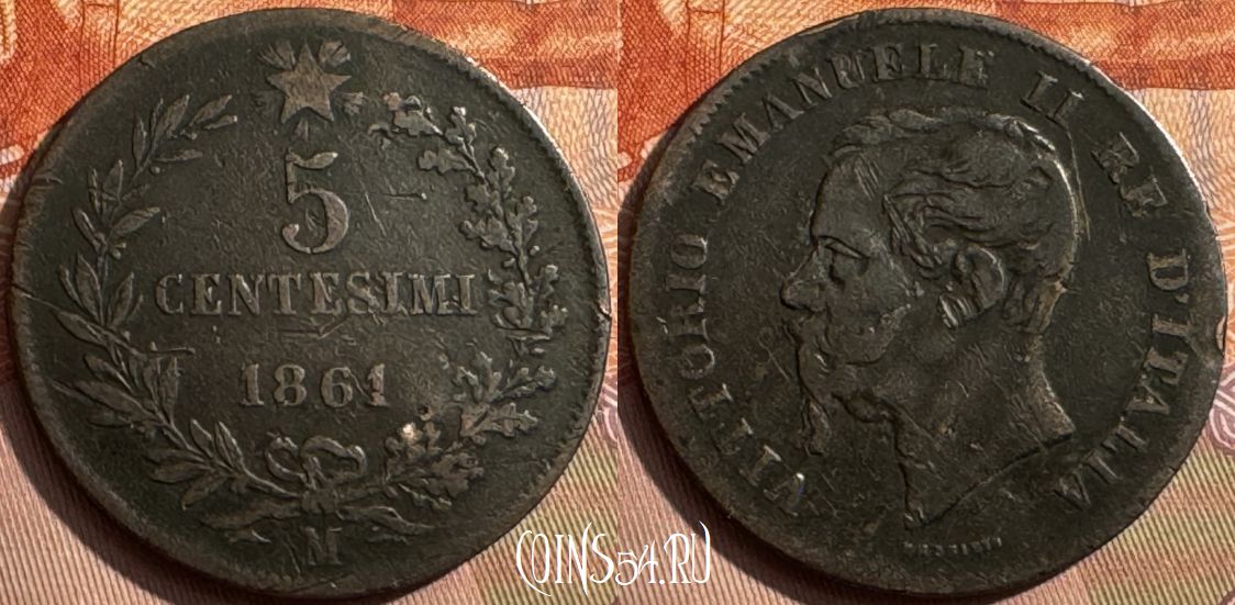 Италия 5 чентезимо 1861 года M, KM# 3, 384s-069