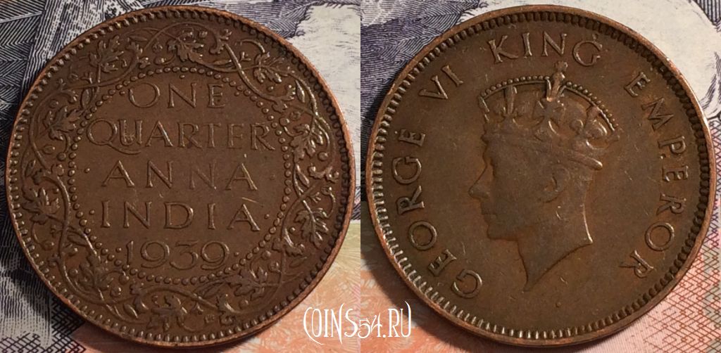 Индия (Британская) 1/4 анна 1939 года, KM# 530, 164-038