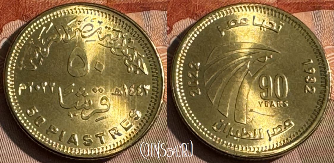 Аверс: ١٤٤٣ ٢٠٢٢ 50 PIASTRES ٥٠ قرشاً جمهورية مصر العربية