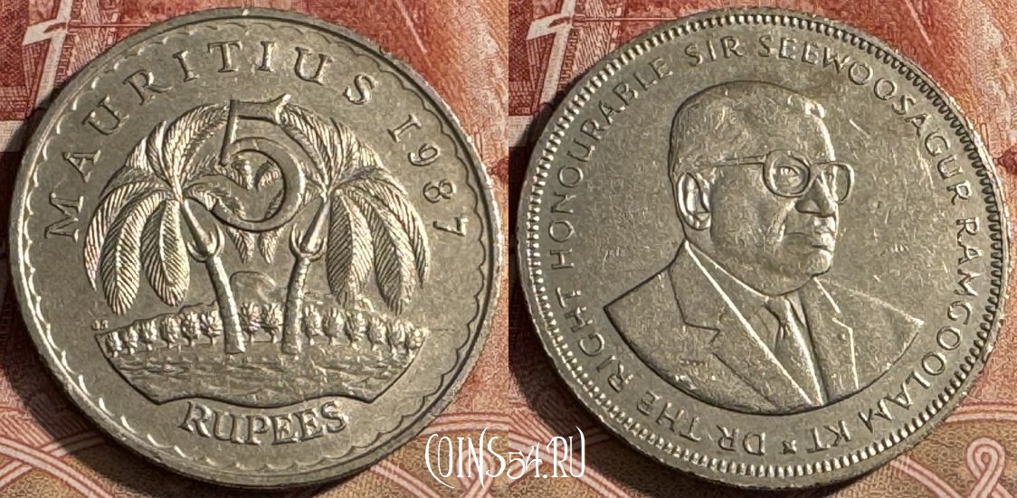 Маврикий 5 рупий 1987 года, KM# 56, 042s-129