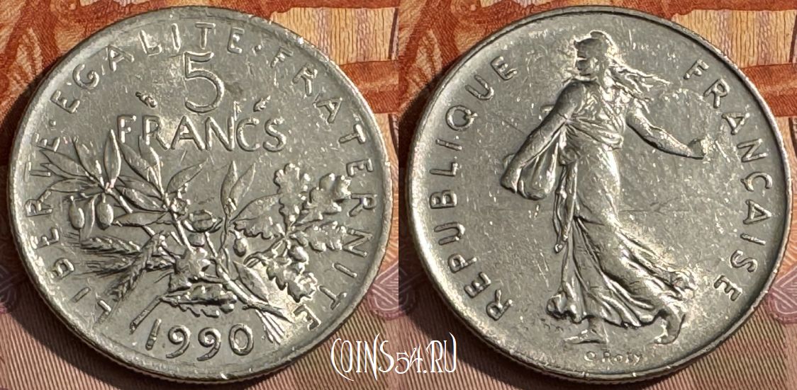 Франция 5 франков 1990 года, KM# 926a, 380s-076