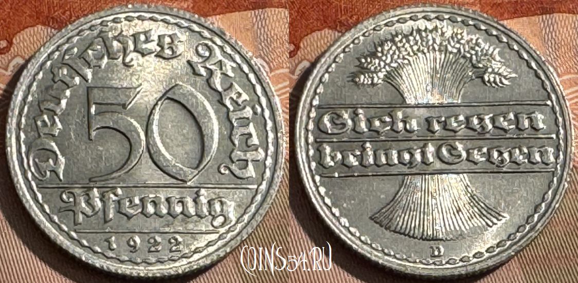 Германия 50 пфеннигов 1922 года D, KM# 27, 510s-054