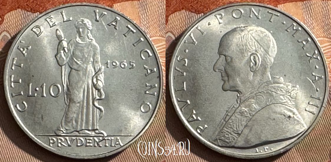 Ватикан 10 лир 1965 года, KM# 79, 515s-130