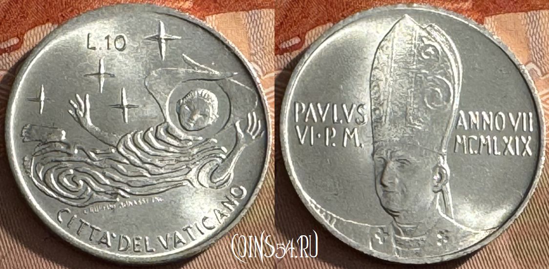 Ватикан 10 лир 1969 года, KM# 111, 516s-071
