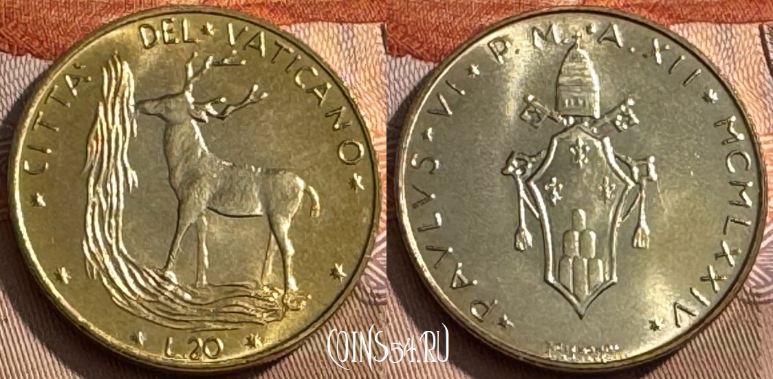 Ватикан 20 лир 1974 года, KM# 120, 515s-121
