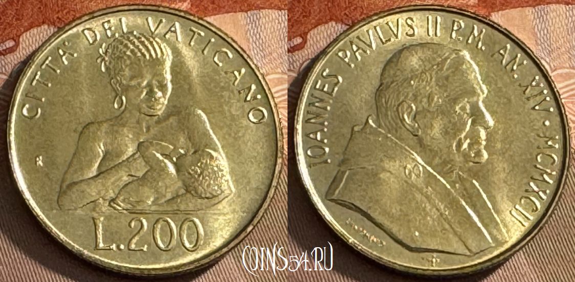 Ватикан 200 лир 1992 года, KM# 240, 516s-120