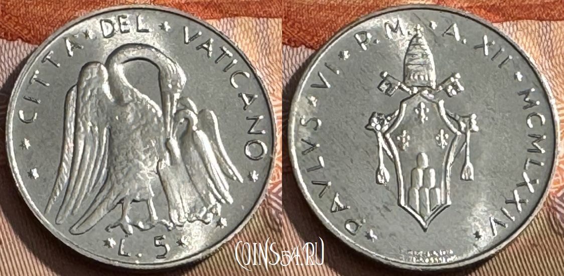 Ватикан 5 лир 1974 года, KM# 118, 515s-119