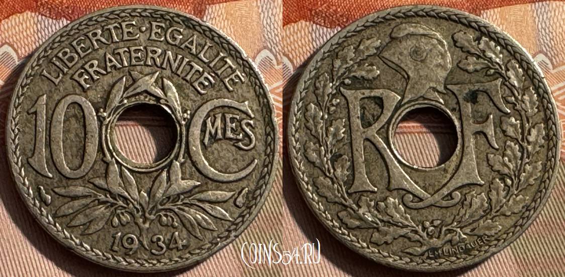 Франция 10 сантимов 1934 года, KM# 866a, 338s-056