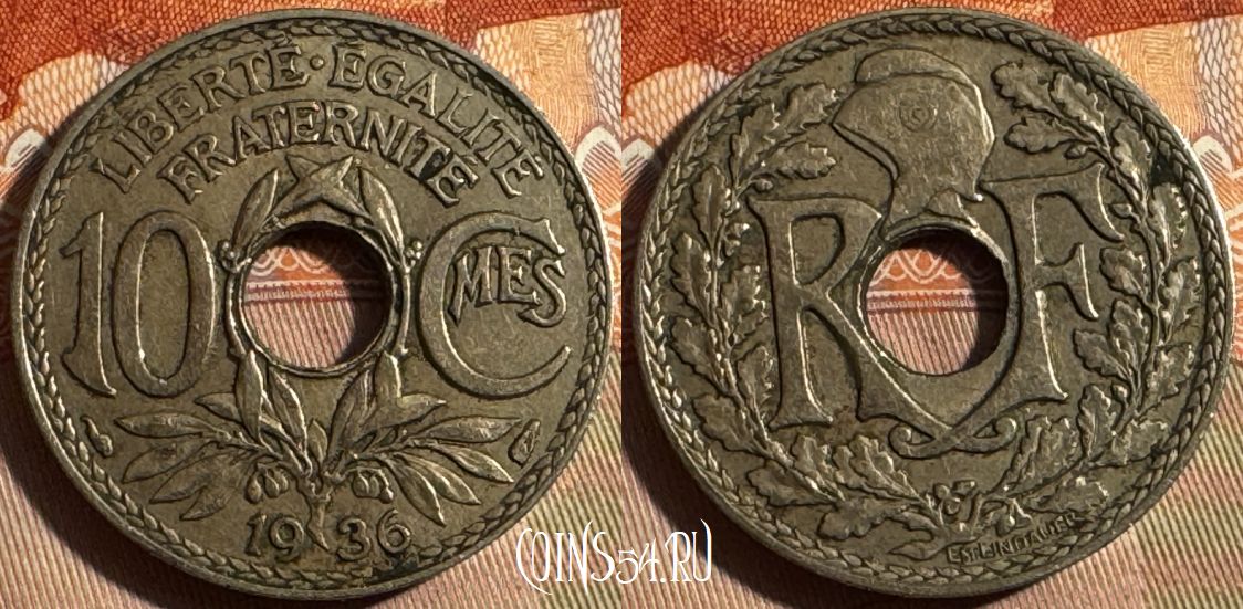 Франция 10 сантимов 1936 года, KM# 866a, 351s-139