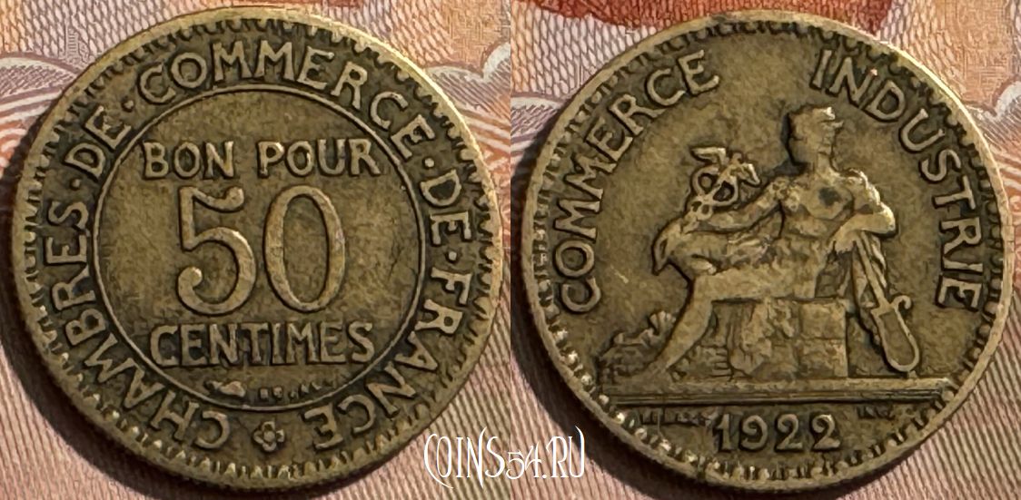 Франция 50 сантимов 1922 года, KM# 884, 309s-117