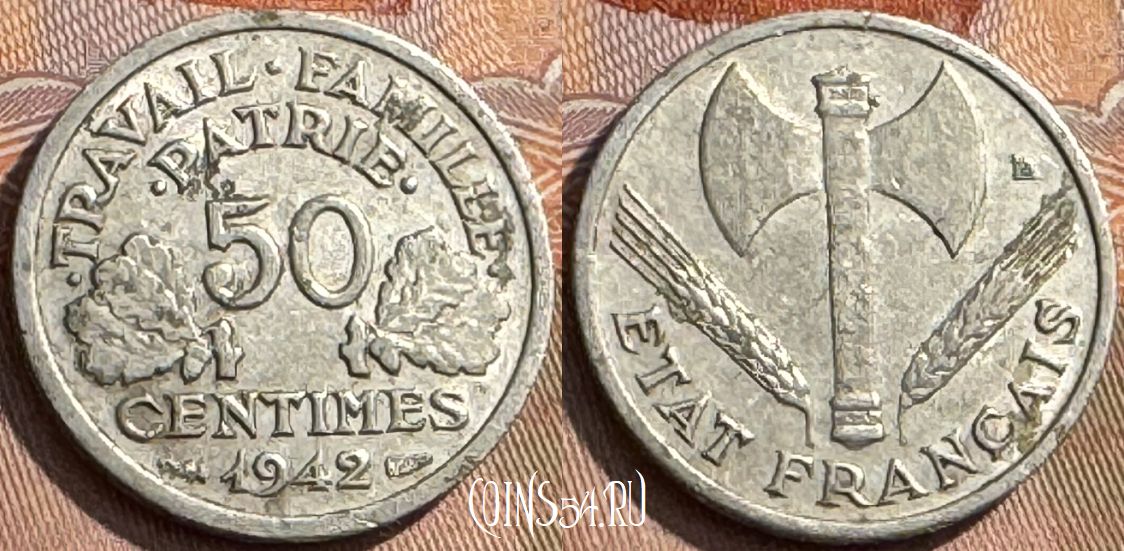 Франция 50 сантимов 1942 года, KM# 914, 315s-073