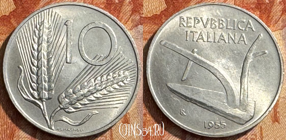 Италия 10 лир 1955 года, KM# 93, 288s-131