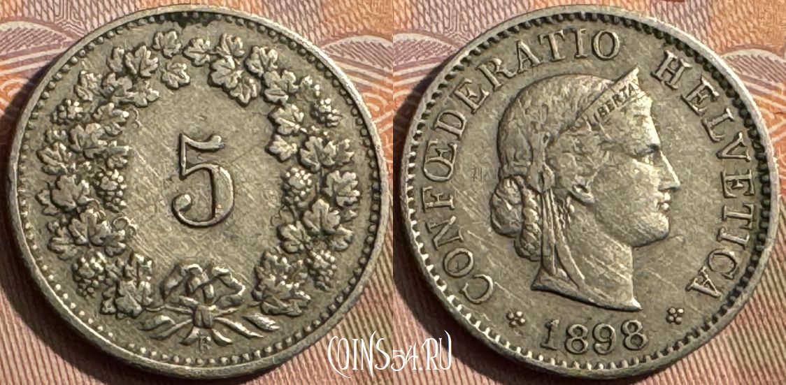 Швейцария 5 раппенов 1898 года, KM# 26, 388s-022