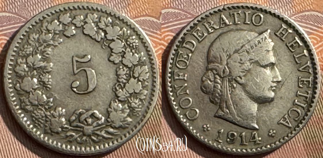 Швейцария 5 раппенов 1914 года, KM# 26, 388s-111