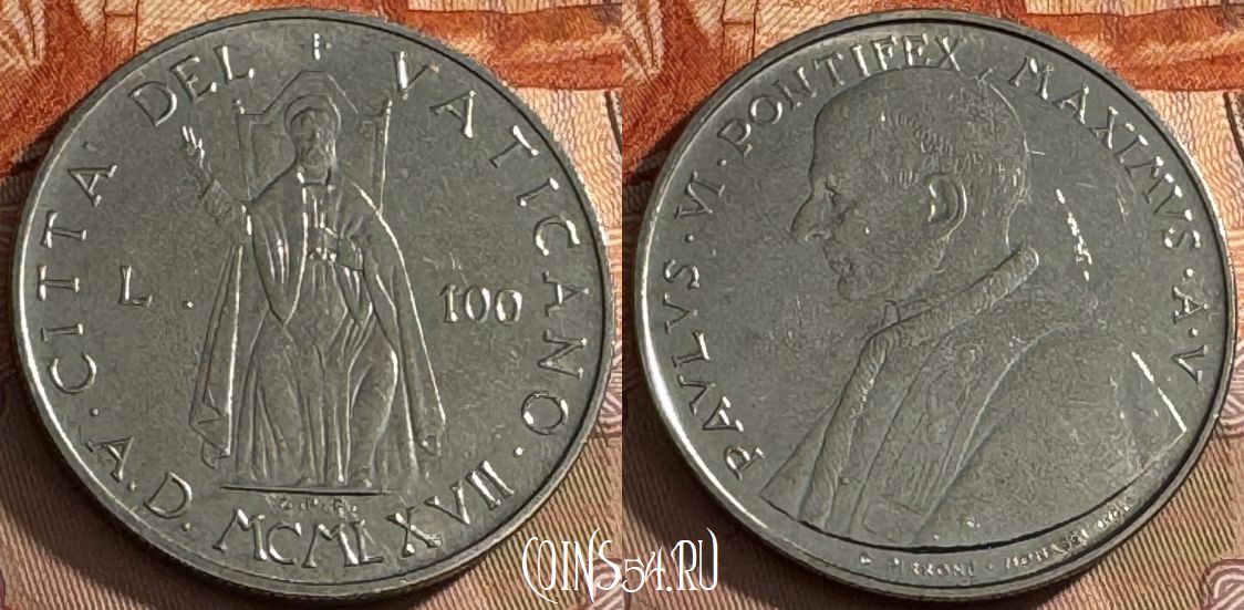 Ватикан 100 лир 1967 года, KM# 98, 516s-014