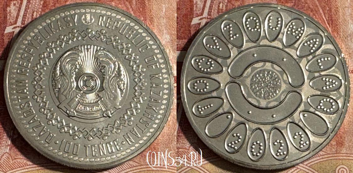 Аверс: 100 TEŃGE QAZAQSTAN RESPYBLIKASY REPUBLIC OF KAZAKHSTAN