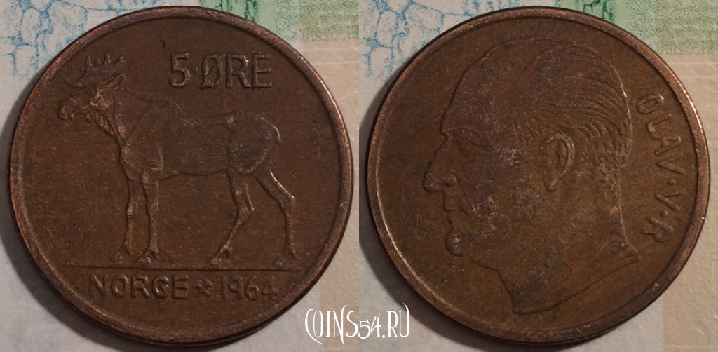 Норвегия 5 эре 1964 года, KM# 405, 189-056