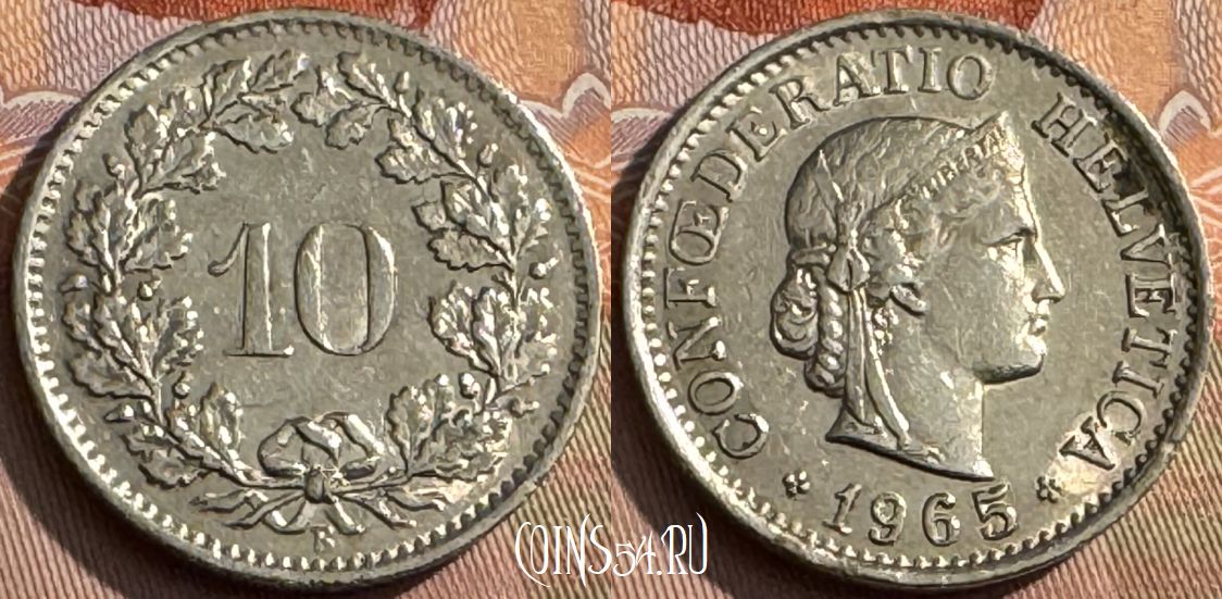 Швейцария 10 раппенов 1965 года, KM# 27, 386s-070