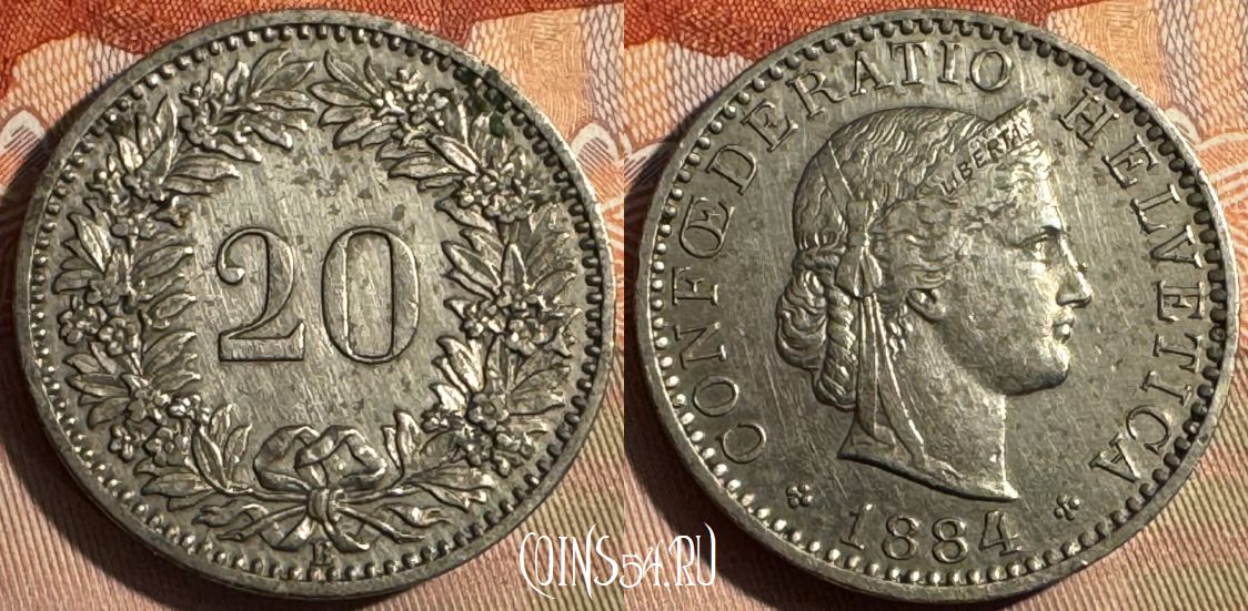 Швейцария 20 раппенов 1884 года, KM# 29, 356s-047