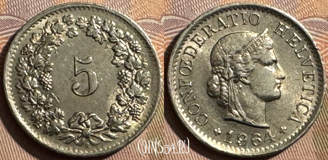 Швейцария 5 раппенов 1964 года, KM# 26, 401s-118