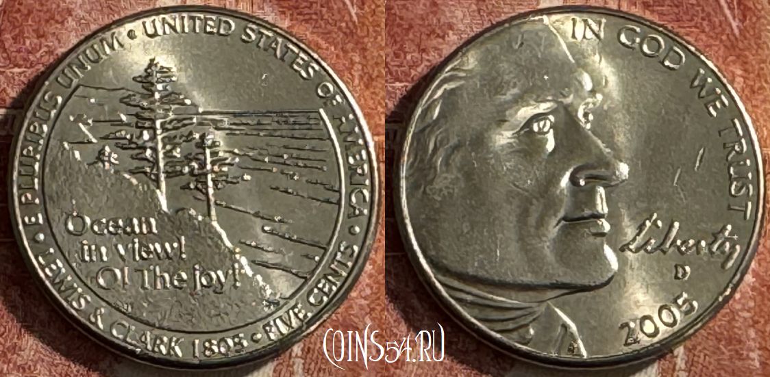 Реверс: E PLURIBUS UNUM FIVE CENTS LEWIS & CLARK 1805 Ocean in view! O! The joy! UNITED STATES OF AMERICA