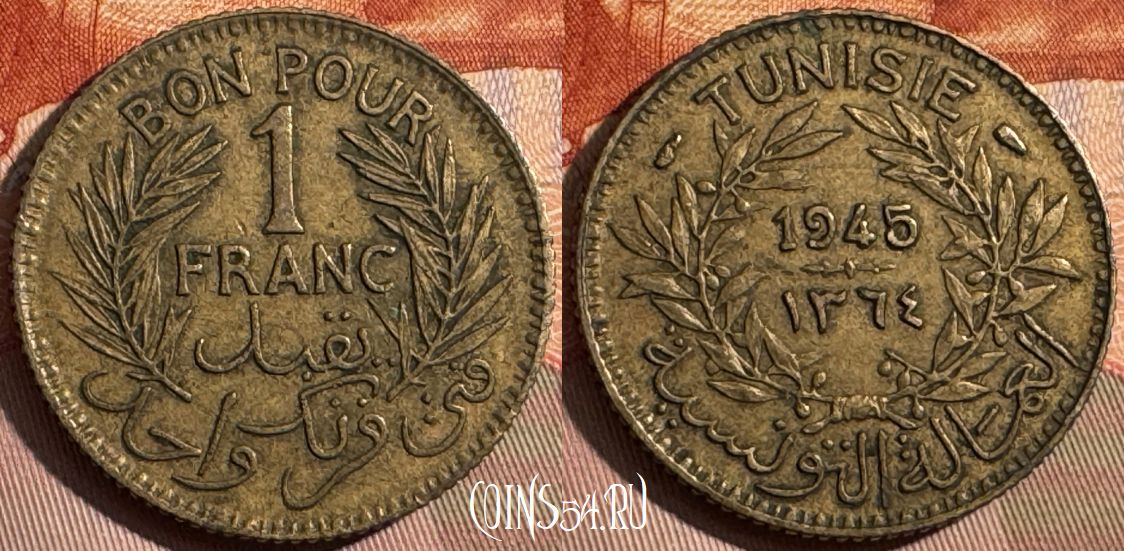 Тунис 1 франк 1945 года, KM# 247, 377s-020