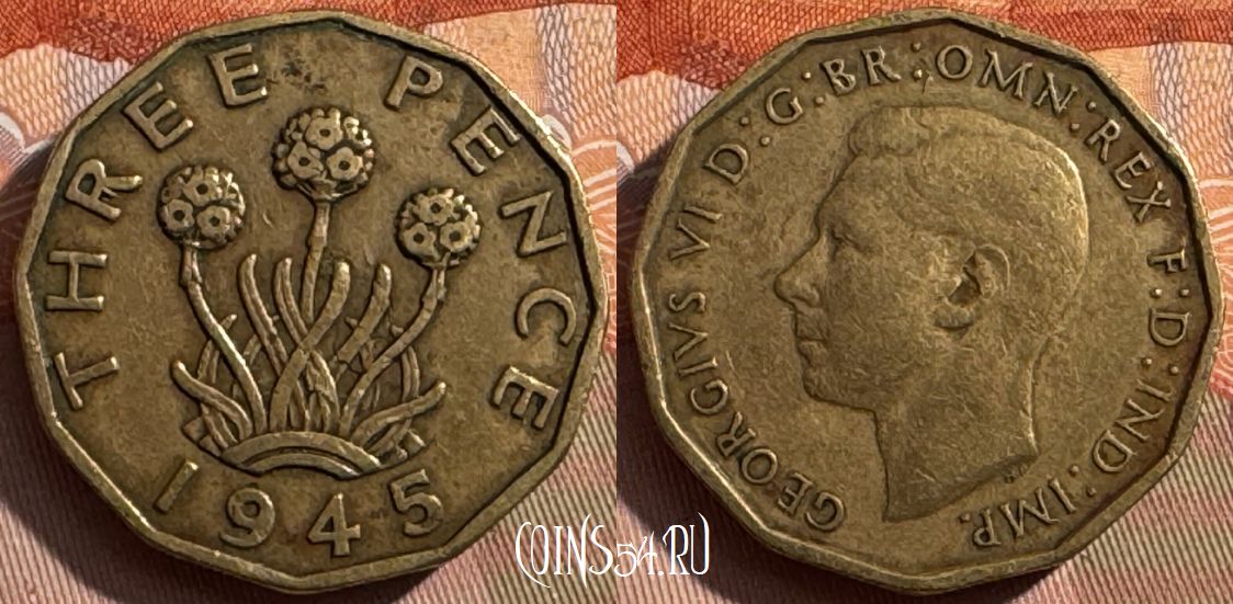Великобритания 3 пенса 1945 года, KM# 849, 390s-026