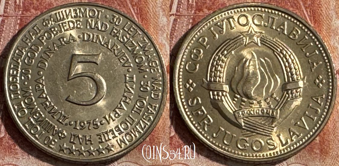 Реверс 1975 30 GOD POBJEDE NAD FAŠIZMOM 30 LET ZMAGE NAD FAŠIZMOM 30 ГОД ОД ПОБЕДАТА НАД ФАШИЗМОТ 30 ГОД ПОБЕДЕ НАД ФАШИЗМОМ 5 DINARA DINARIEV ДИНАРА ДИНАРИ