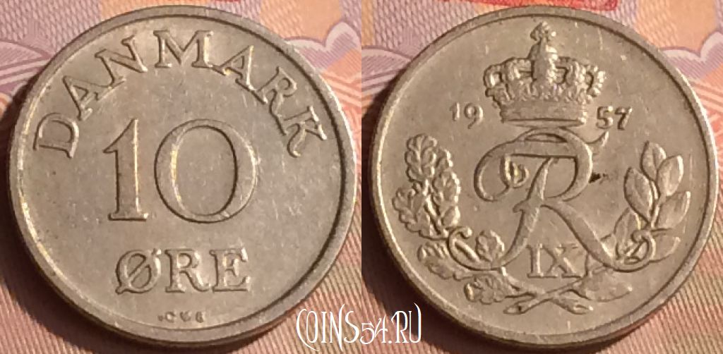 Дания 10 эре 1957 года, KM# 841, 431-021
