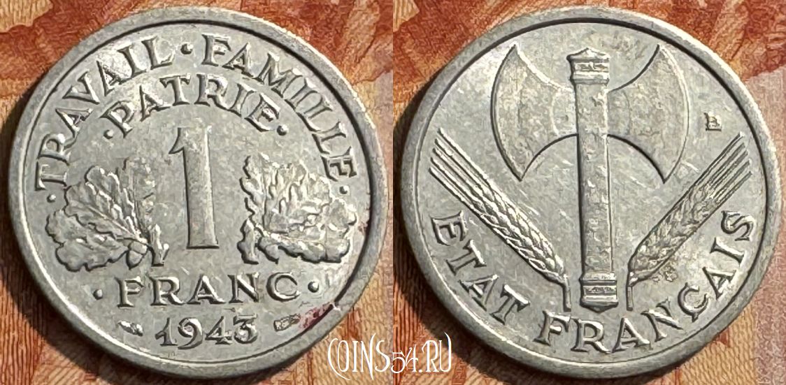 Франция 1 франк 1943 года, KM# 902, 290s-135