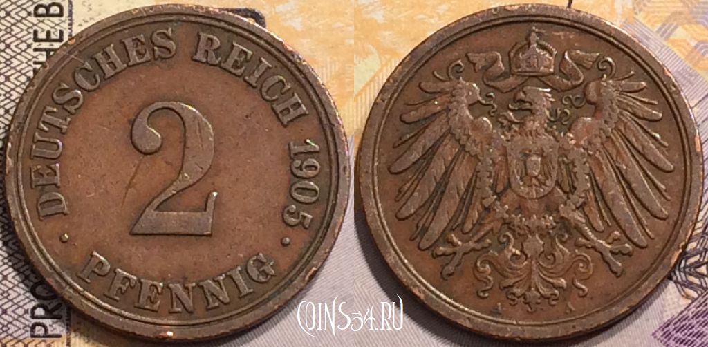 Германия 2 пфеннига 1905 года A, KM# 16, 146-107