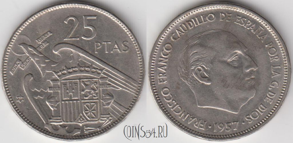 Испания 25 песет 1957 года, 59 внутри звезды, KM# 787, 129-003